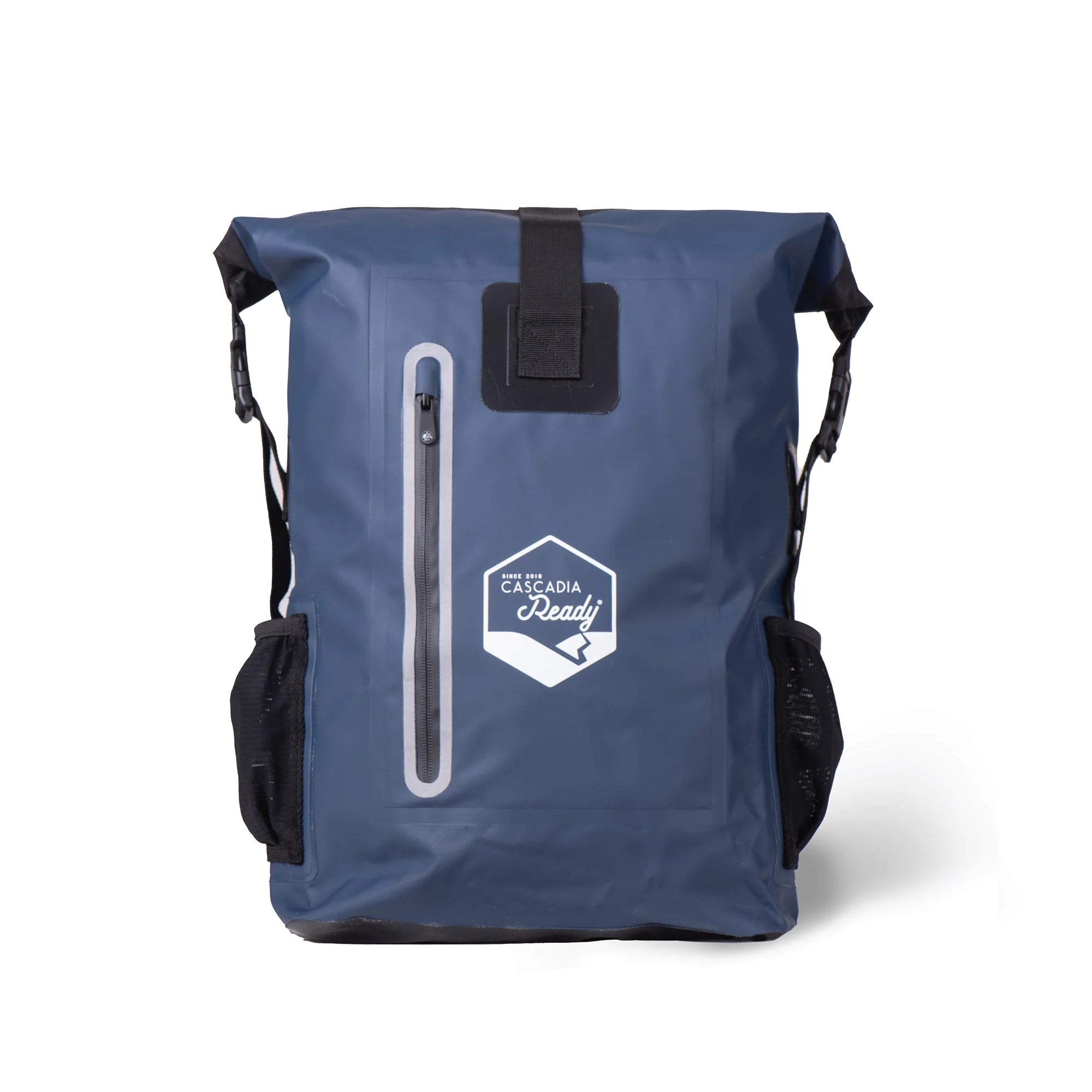 Waterproof Backpack. 25-Liter dry bag backpack. Exterior zip pocket with reflective tape + 2 bottle holders.